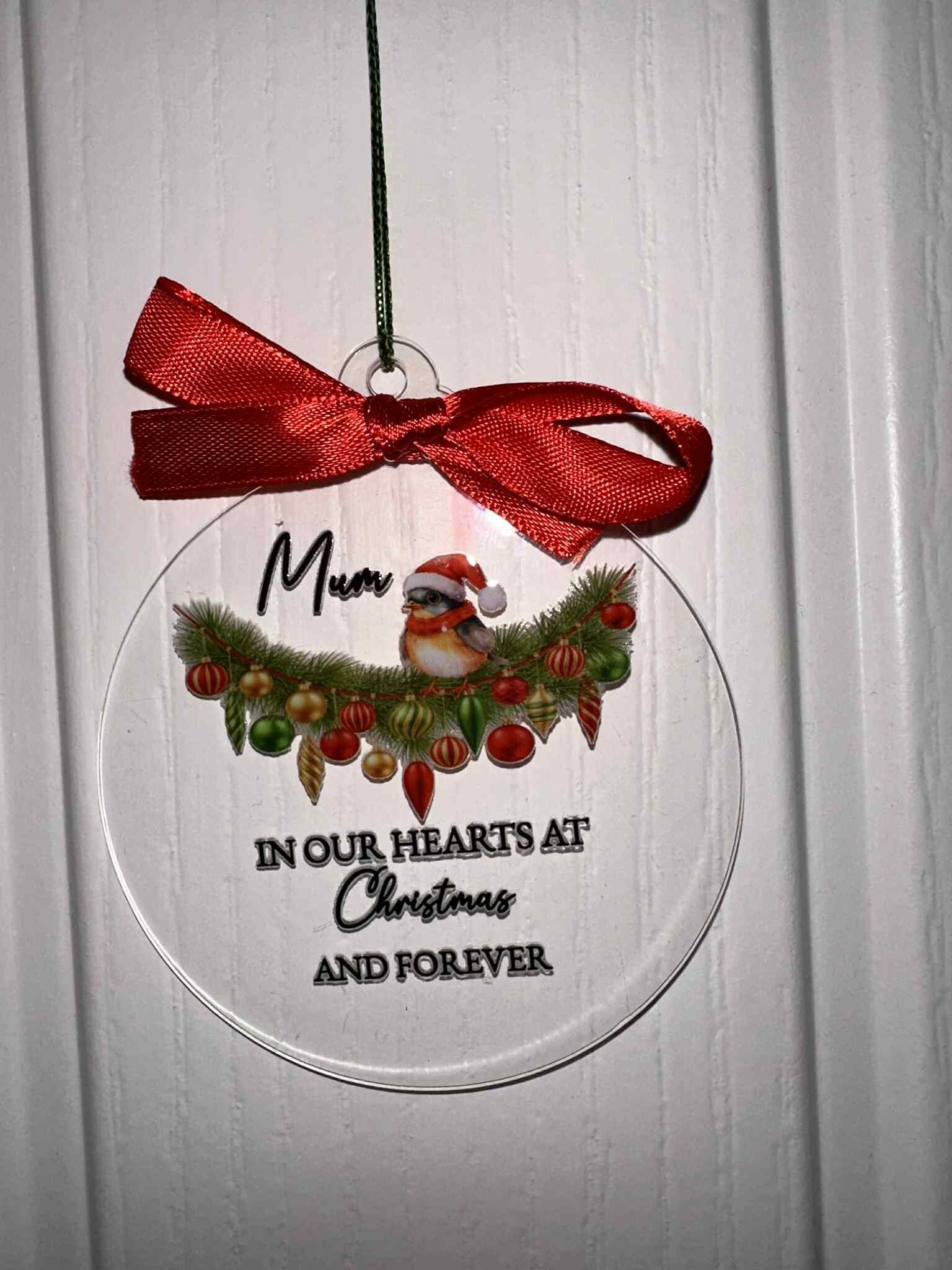 Personalised Memorial Baubles in Memory of Your Loved Ones Plastic 7cm with Red Bow and Festive Design